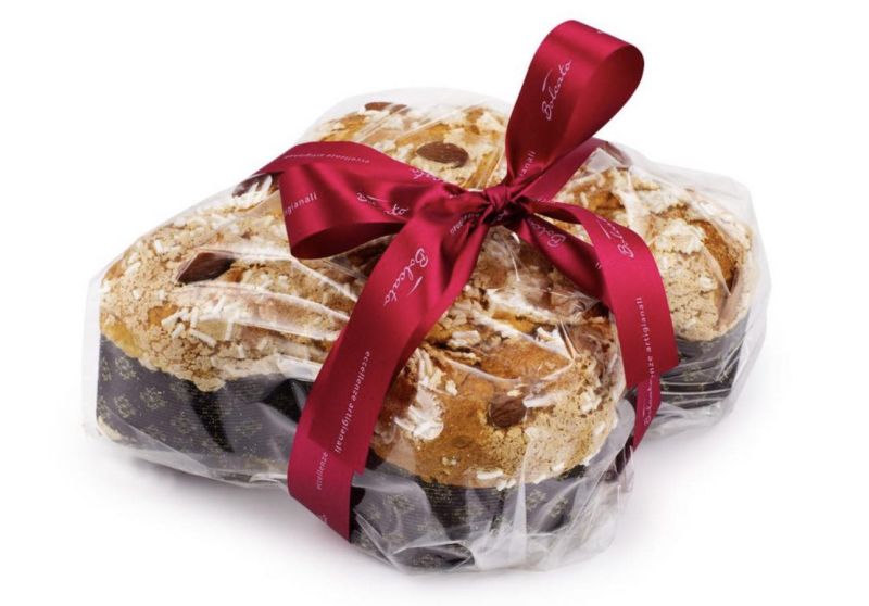 КЛАСИЧЕСКИ КОЗУНАК - КОЛОМБА НА МАРКАТА "ДУКА МУСКАТИ" - 700 ГР. /голяма опаковка/ В ПРОЗРАЧЕН ЦЕЛУФАН С БАДЕМИ, ПОРЪСЕН СЪС ЗАХАРОСАНИ ПРЪЧИЦИ А ВЪТРЕ СЪС СТАФИДИ И ПОРТОКАЛОВИ КОРИЧКИ