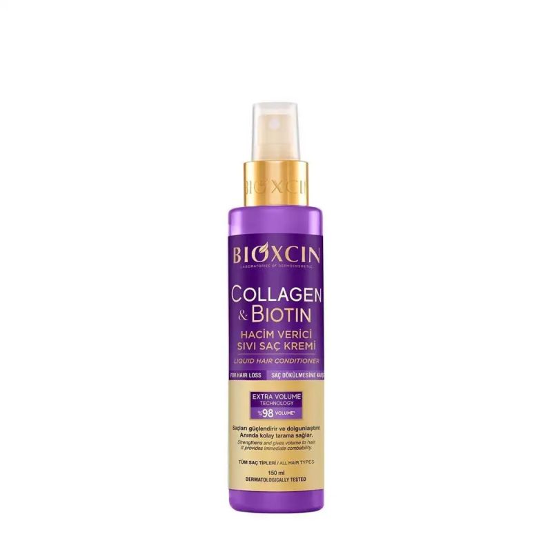 Течният балсам за коса Bioxcin Collagen Biotin Volumizing Liquid Hair Conditioner придава обем и укрепва тънката, без обем и слаба коса с хидролизиран колаген, биотин и биоактивни пептиди, които съдържа.