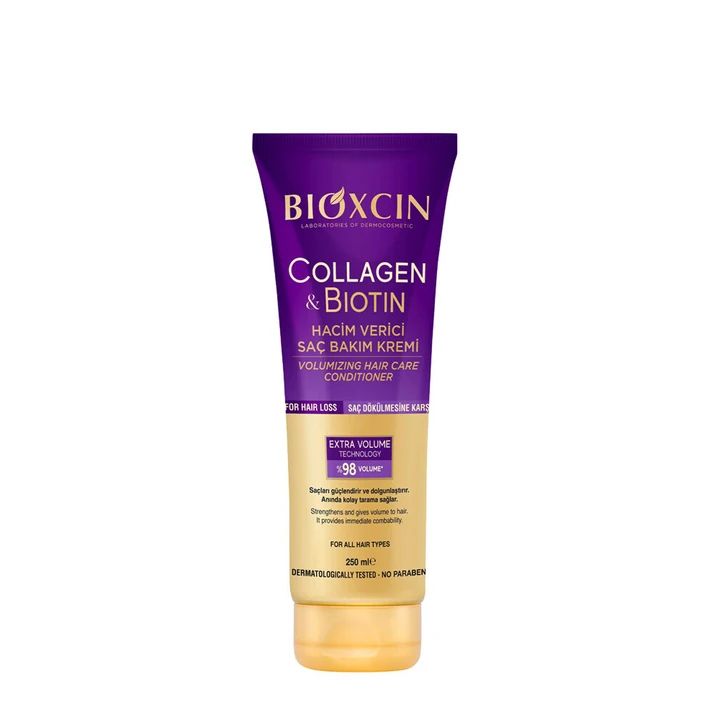 Кремът за обем на косата Bioxcin Collagen Biotin придава обем и укрепва фината, сплескана и слаба коса с хидролизиран колаген, биотин и биоактивни пептиди.