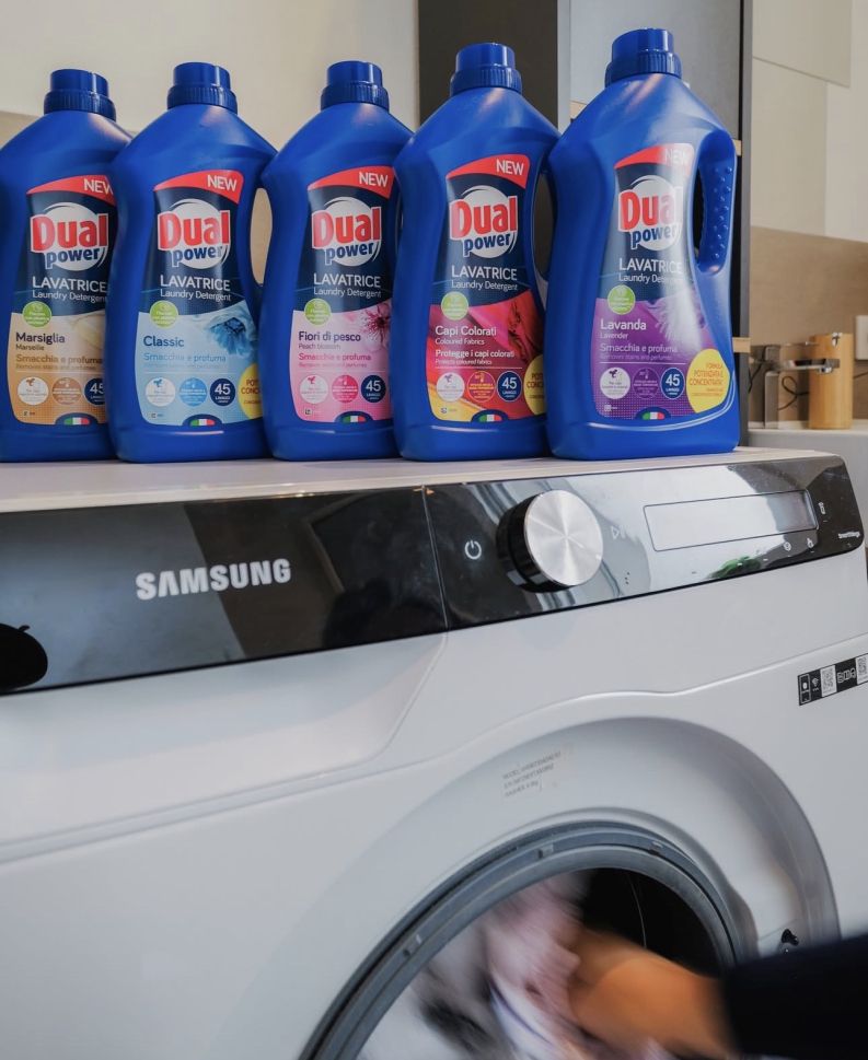 ИТАЛИАНСКИ ТЕЧЕН ГЕЛ ЗА ЦВЕТНИ И ТЪМНИ ДРЕХИ "ДУАЛ ПАУЪР", С АРОМАТ НА ЛАВАНДУЛА - ЗАПАЗВА ЦВЕТА НА ДРЕХИТЕ ДОРИ И СЛЕД МНОГОКРАТНА УПОТРЕБА, ГОЛЯМА ОПАКОВКА ОТ 1800 МЛ ЗА 45 ПЕРАЛНИ