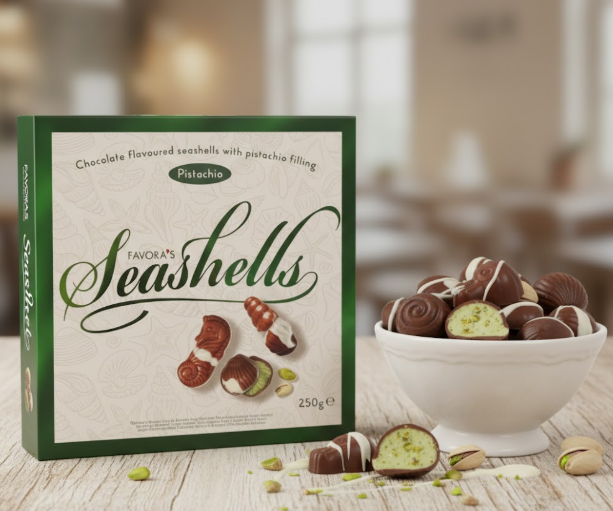 СЕАШЕЛС ШОКОЛАДОВИ БОНБОНИ МОРСКО ДЪНО С ПЪЛНЕЖ ШАМ ФЪСТЪК 250 ГР