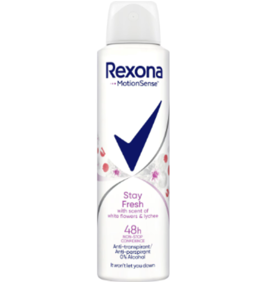 Rexona Stay Fresh 150 мл е серия дезодоранти против изпотяване (спрей), осигуряващи до 48 часа защита и свежест благодарение на технологията MotionSense™. Продуктите не оставят следи по дрехите, действат чрез активни микрокапсули при движение и са дерматологично тествани.