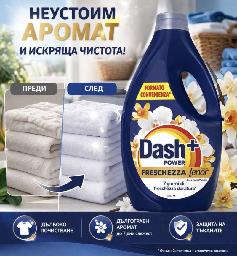 ТЕЧЕН ПРАХ "ДАШ" ТЕЧНИЯ ГЕЛ С НАЙ-ДОБРОТО ДЕЙСТВИЕ ЗА ПОЧИСТВАНЕ И ОТСТРАНЯВАНЕ НА ВСЯКАКВИ ПЕТНА ПО ДРЕХИТЕ ВЕЧЕ И С НОВ АРОМАТ ЗЛАТНА ОРХИДЕЯ ! НЯМА ТАКЪВ АРОМАТ! СТРАХОТЕН ЗА ПРАНЕ НА НИСКИ ТЕМПЕРАТУРИ И ДЕЛИКАТНИ ТЪКАНИ! ЗНАЕТЕ, ЧЕ ДАШ Е НАЙ-ДОБРИЯ!