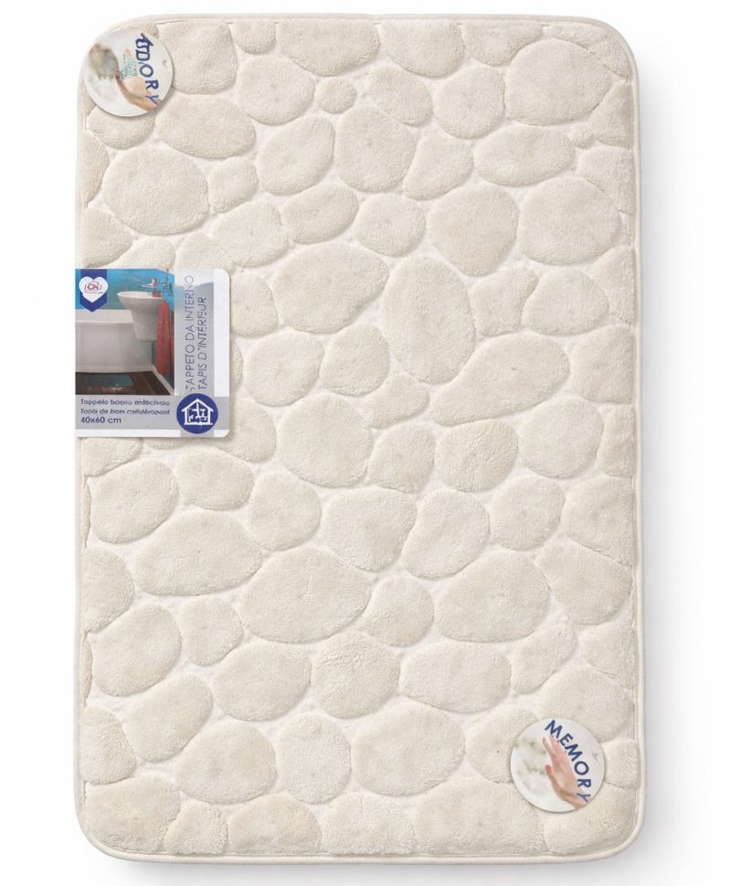 Елегантно и меко килимче за баня в нежен бежов цвят, което създава усещане за комфорт и уют. Релефната повърхност с дизайн тип „камъчета“ масажира стъпалата и прави стъпването приятно след баня или душ. Изработено с memory пяна, килимчето се адаптира към формата на крака и осигурява допълнителна мекота.