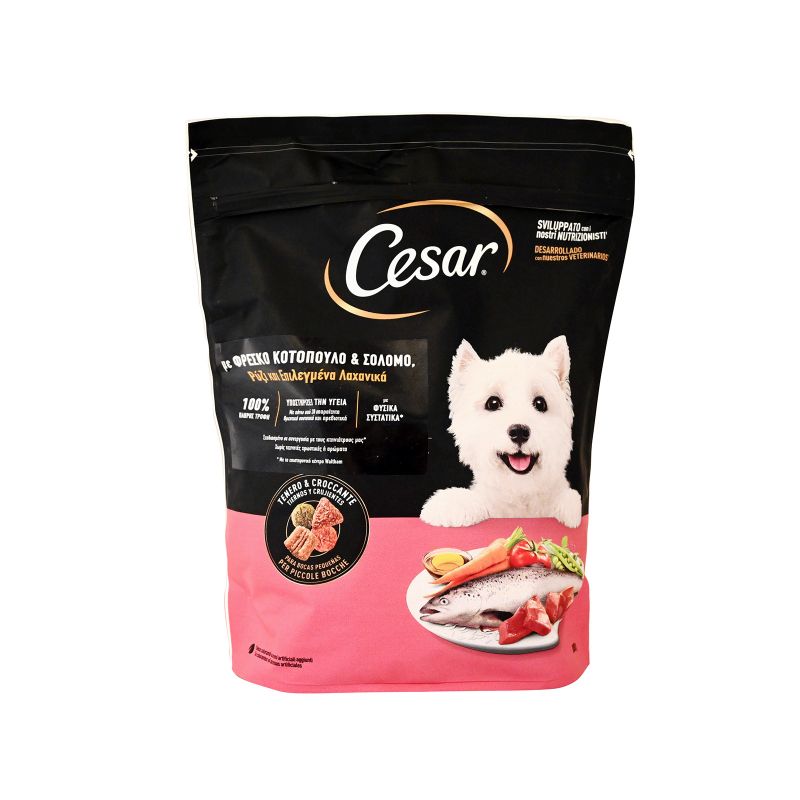 ИТАЛИАНСКА КУЧЕШКА ХРАНА КЕСАР ЗА МАЛКИ ПОРОДИ, СЪС СЬОМГА, ОРИЗ И ЗЕЛЕНЧУЦИ 800 ГР