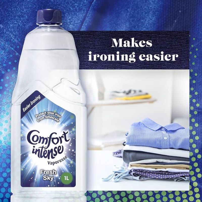 АРОМАТИЗРАНА ВОДА ЗА ЮТИЯ “COMFORT” - СИНЬО НЕБЕ, СВЕЖ НЕЖЕН ДЪЛГОТРАЕН АРОМАТ, 1000 МЛ, ПРАВИ ГЛАДЕНЕТО ПО-ЛЕСНО, А ДРЕХИТЕ МНОГО АРОМАТНИ, Придава уникален аромат на Вашите дрехи и подпомага лесното им изглаждане. Водата за гладене Комфорт е специално дестилирана, за да не образува котлен камък във Вашата ютия
