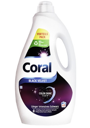 ТЕЧЕН ГЕЛ “КОРАЛ” ЗА ПРАНЕ НА ЧЕРНИ ДРЕХИ, С ГРИЖОВНА ФОРМУЛА ЗА ДЕЛИКАТНИ ТЪКАНИ, С ПАРФЮМЕН АРОМАТ, ДЪЛГОТРАЙНОСТ, КАЧЕСТВО И ПЕРФЕКТНО ИЗПИРАНЕ, ЗА 40 ПЕРАЛНИ