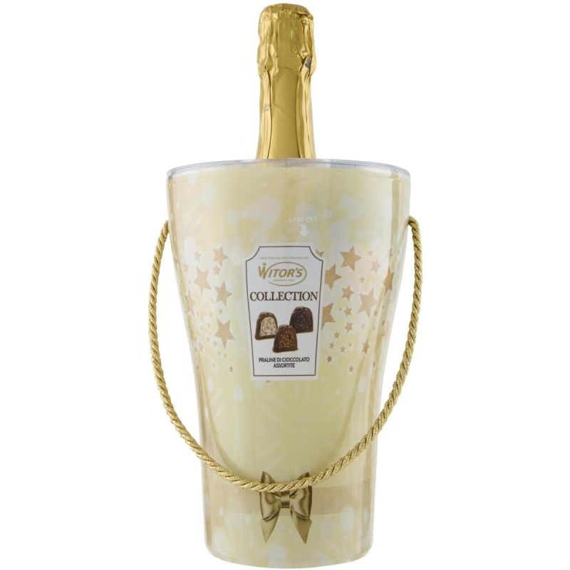 ПРАЗНИЧНА ШАМПАНИЕРА С ШОКОЛАДОВИ БОНБОНИ УИТОРС АСОРТИ 150 ГР И БУТИЛКА ДЕСЕРТНО ПЕНЛИВО БЯЛО ВИНО 750 МЛ / ЗЛАТНА/