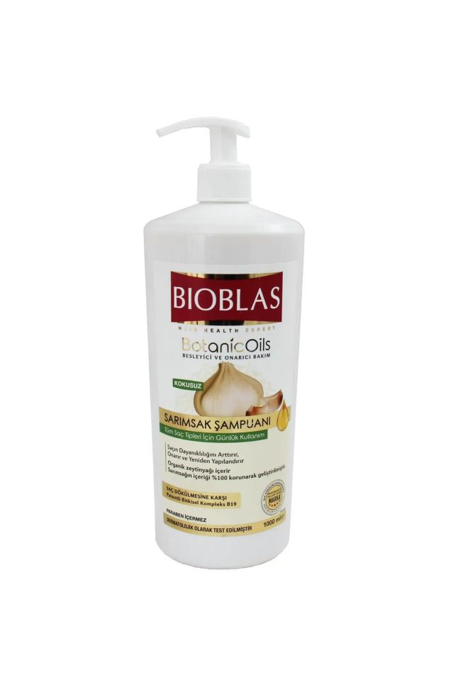 Mарка BIOBLAS е номер 1 в Турция за третиране на проблемни и болни коси.Шампоана е специално за лечение за капещи,изтощени,проблемни и други болни коси при жени и мъже Подсилва растежа, стопира косопада, повишава регенерирането на нови космени фоликули, премахва вредните токсини от кожата на главата, подобрява структурата на косъма и укрепва корените на косата! Алицинът в чесъна помага за увеличаване на кръвообращението в кожата на главата, което от своя страна заздравява корена и цялостната структура на косъма. Този химичен елемент изпълнява и значима роля в стимулирането растежа на косата. Чесънът също има антибактериални и противогъбични свойства, които помагат при лечение на пърхот и сърбеж по скалпа. Сярата пък, присъстваща в състава на чесъна, също е верен помощник в борбата срещу пърхота и предотвратява риска от неговата повторна поява.Kрай на косопада с BIOBLAS !!!!